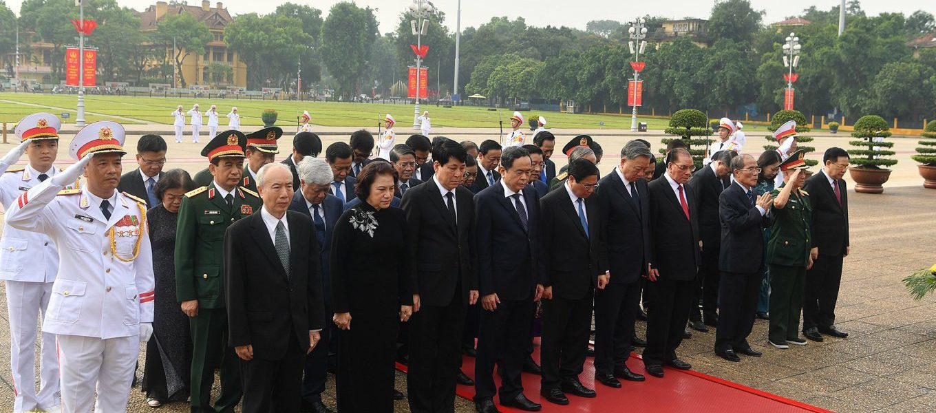 Tham gia đoàn viếng có Chủ tịch nước Tô Lâm, Thủ tướng Phạm Minh Chính, Chủ tịch Quốc hội Trần Thanh Mẫn, Thường trực Ban Bí thư Lương Cường, Chủ tịch Ủy ban Trung ương Mặt trận Tổ quốc Việt Nam Đỗ Văn Chiến.